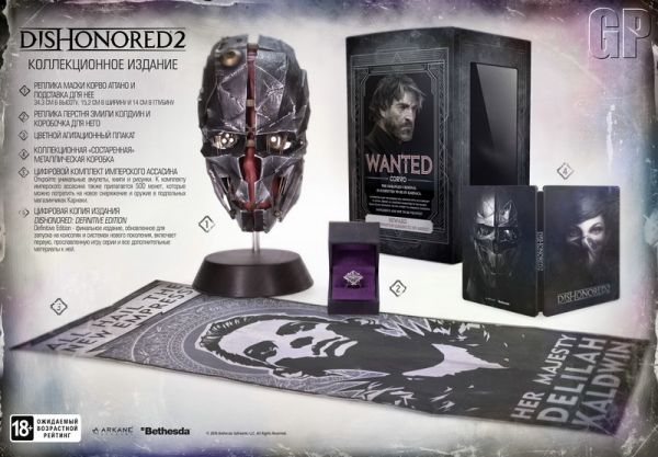 Вместе с обычным изданием Dishonored 2 вышло и коллекционное издание игры. Заявленная за предзаказ простого издания цена составляет 1999 рублей, а коллекционное издание можно было приобрести за более чем 3600 рублей. В коллекционке Дисхоноред игроков ждёт: классическая маска Корво с подставкой, кольцо Эмили Колдуин с коробкой, агитационный плакат-постер, красивая металлическая коробка "под старину" и, конечно же, цифровые фишки и плюшки для самой игры - новые книги, рисунки и амулеты в том числе.