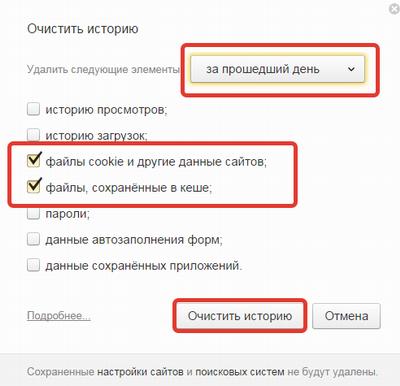 • Укажите галочками, что удалить: файлы cookie и файлы, сохраненные в кеше (историю просмотров и историю загрузок, равно как и пароли с другими данными удалять не требуется)