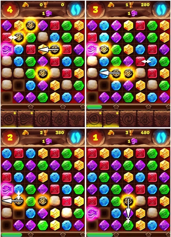 Разбивать самоцветы лучше только в области нужных клеток. Потом собрав тотем #2 разбить самый верхний второй кубик #2, далее разбить оставшиеся клетки.