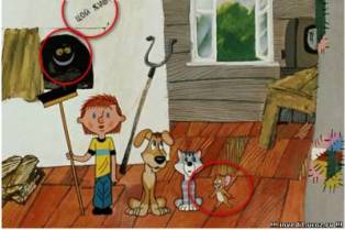 В нем найдено три фотоляпа: надпись на печке "Хой жив", улыбающаяся мордочка в печке и мышь из фильма "Том и Джерри" рядом с котом Матроскиным.