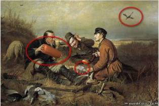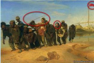 На неё мы видим три фотоляпа: удочка в руке бурлака, красный флаг на корабле и чужое лицо у одного из бурлаков.