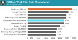 Если в первых тестах в операциях с целым числом и плавающей точкой в одноядерном режиме Exynos 9810 уделал Snapdragon 845 вчистую, то в тестах ниже все выглядит с точностью да наоборот. Детально расписывать что и почему нет смысла, так как это, можно сказать, предварительные данные - тестировались семплы с MWC 2018, у которых еще сыроватая прошивка. Тем не менее уже сейчас заметен существенный разрыв между показателями Exynos 9810 и Snapdragon 845. Почему при лучшей производительности на ядро самсунговский чип проигрывает в скорости работы системы американцу - загадка.