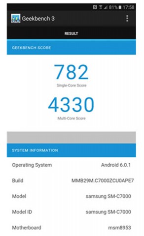 Стоит отметить, что смартфон Galaxy C7 получил один из самых новейших процессоров на сегодняшний день - это чипсет Qualcomm Snapdragon 625, который в свою очередь построен по 14-нм технологии FinFET. Snapdragon 625 на данный момент установлен всего в два смартфона - Galaxy C7 и ZenFone 3. Сам по себе процессор занимает среднюю позицию между бюджетным Snapdragon 617 и производительным Snapdragon 652, при этом в Антуту выдавая порядка 60 000 баллов.