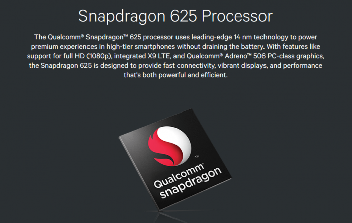 Телефон работает на базе относительно нового процессора Snapdragon 625. Он был представлен в начале зимы 2016 года и тепло встречен производителями смартфонов и публикой в целом. Этот процессор привлекателен по нескольким причинам: он построен по современному энергоэффективному техпроцессу 14-НМ, в распоряжении чипа восемь ядер Cortex-A53, работающие с частотой до 2 ГГц, процессор поддерживает функцию быстрой зарядки и все современные сети.